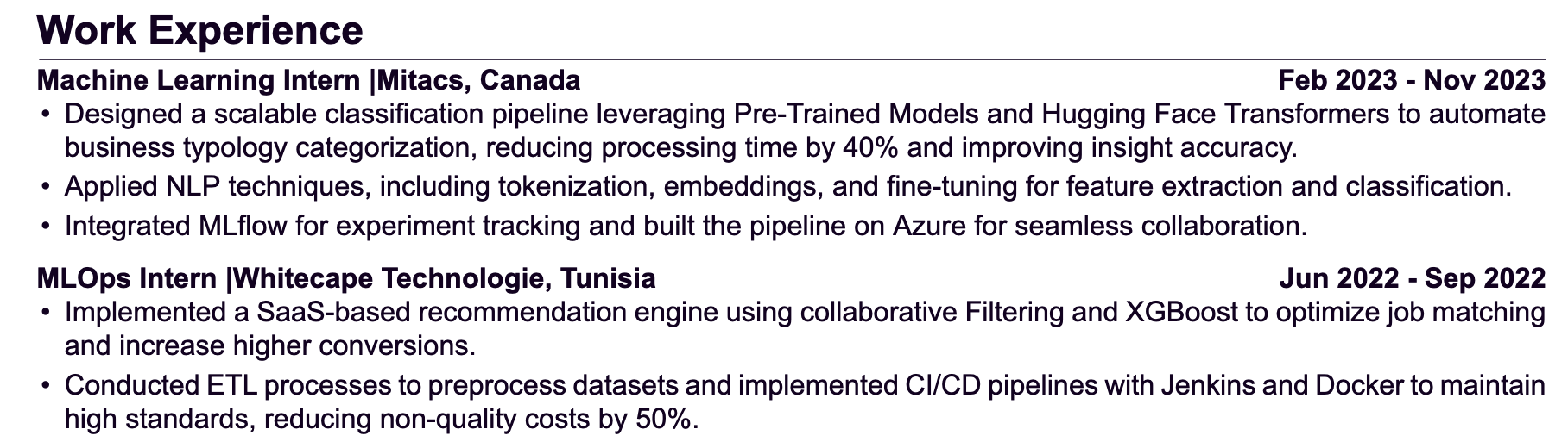 I am Chaima Jaziri, an MLOps Engineer with a strong foundation in machine learning, natural language processing, and scalable software engineering. With over three years of experience, I specialize in designing robust AI solutions, building efficient pipelines, and deploying scalable models on cloud platforms.